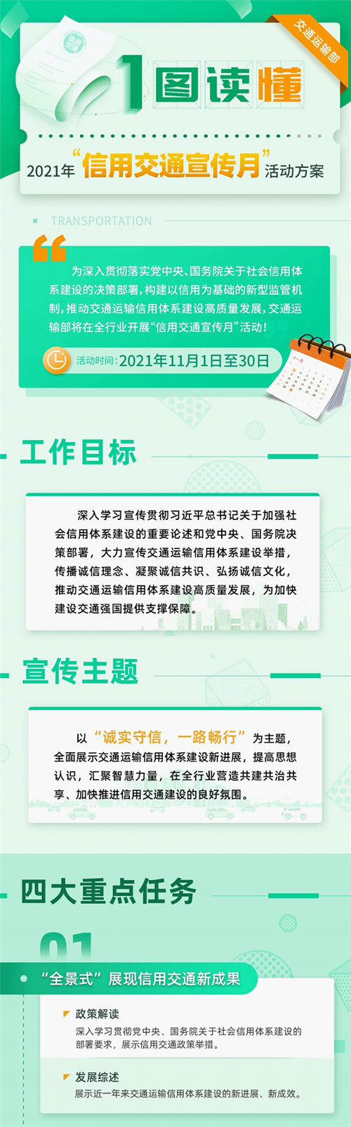 根據(jù)交通運(yùn)輸部部署, 2021年“信用交通宣傳月”活動(dòng)已經(jīng)正式啟動(dòng)。本次活動(dòng)以“誠(chéng)實(shí)守信,一路暢行”為主題,采取全方位、多角度、融媒體形式,全面展示交通運(yùn)輸信用體系建設(shè)新進(jìn)展新成效,深入報(bào)道我市交通運(yùn)輸部門(mén)在重點(diǎn)領(lǐng)域信用專(zhuān)項(xiàng)治理、數(shù)字信用、信用監(jiān)管、“信用+”工程建設(shè)等方面的創(chuàng)新經(jīng)驗(yàn)做法,努力在全行業(yè)營(yíng)造誠(chéng)實(shí)守信良好氛圍。